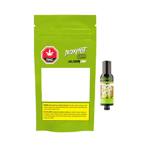 BOXHOT PRESENTS Alien OG, a 1.2g 510 threaded vape, featuring a colossal 1000mg of THC and some of the purest cannabis distillate available on the market. This extraterrestrial monster blasts you with gas, earthy and lime flavours on the inhale, and leaves you with a fruity and pine exhale. All Boxhot vapes are manufactured with exclusive, oversized hardware, making them optimized for big, full hits. Better yet, all BOXHOT vapes are produced with industry-leading CO2 extraction and refining processes, and feature an entourage of expertly infused premium strain-specific terpenes. All BOXHOT vape carts now work with auto-draw batteries. Device not included.